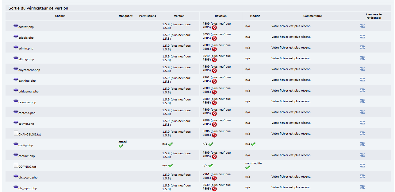 Certains fichiers qui existaient dans les anciennes versions doivent être supprimés plus tard. Ceux qui peuvent avoir un problème de sécurité sont affichés avec le mot "effacé" dans la colonne "manquant". Si vous voyez de tels fichiers, utilisez votre client FTP pour effacer les fichiers que le vérificateur de version vous signale. Laisser les fichiers là ou ils sont, (en ignorant les suggestions données par le vérificateur de version) pose un problème de sécurité et n'est donc pas recommandé.